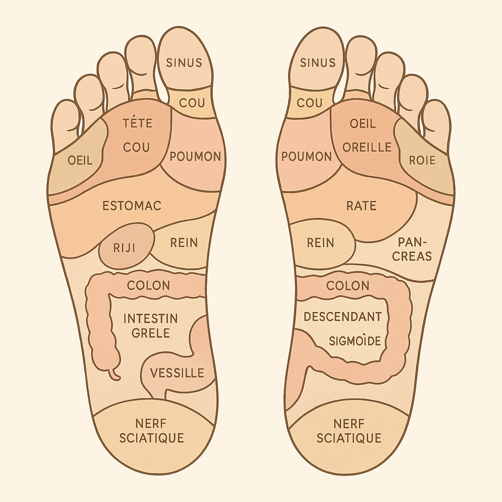 Chaque zone réflexe correspond à un organe, une glande ou une structure corporelle. Par exemple, les orteils sont liés à la tête, au cerveau, au cou, aux dents et aux sinus, tandis que le talon correspond aux organes pelviens et au nerf sciatique. Donc, en stimulant ces points, on active des réactions dans le corps qui peuvent aider à soulager la douleur, améliorer la circulation sanguine et lymphatique, réduire le stress et favoriser le sommeil.